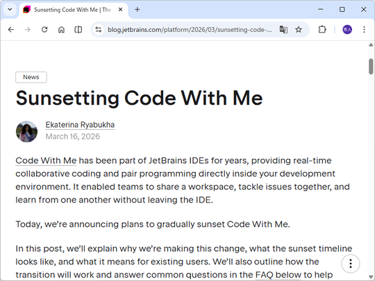 同社製IDEで「Code With Me」が正式にサポートされるのは、バージョン「2026.1」が最後となる。IDEへのバンドルは終了し、「JetBrains Marketplace」を通じたプラグインとしての提供並行する。