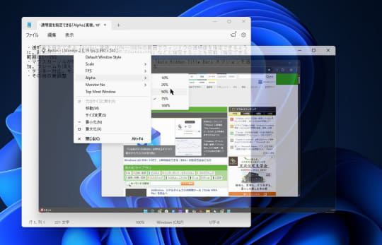 - 透明度を指定できる「Alpha」実装。10%~100%の範囲でウィンドウの透明度を指定できるように。起動時にコマンドラインオプションで「/alpha:128」などと指定することも可能(指定できる範囲は1~255)