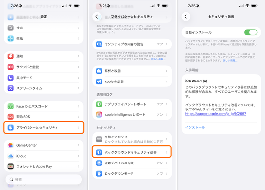 「バックグラウンドセキュリティ改善」(Background Security Improvements)とは、「Safari」(WebKit)などで発見された比較的小規模なセキュリティ問題へ迅速に対処するための仕組み。OSの再起動は必要だが、バージョンの更新は不要だ。「iOS 26.1」、「iPadOS 26.1」、「macOS 26.1」以降でサポートされており、既定で有効化されている。