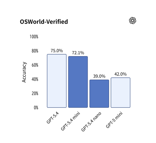 「GPT‑5.4 mini」 は「GPT-5 mini」の能力を全面的に上回るだけでなく、2倍以上の速さで動作する。「SWE-Bench Pro」や「OSWorld-Verified」といった主要ベンチマークでも、より大きな「GPT-5.4」モデルに続く成績を残しており、能力と性能のバランスに優れる。とくにPC操作(Computer Use)には優れており、「GPT-5.4」モデルに迫る正確さだ。