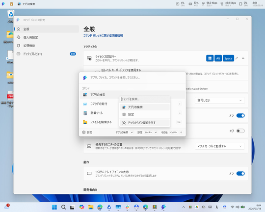 [Windows]+[Alt]+[Space]キーで起動できるコマンドランチャー「コマンド パレット」(Command Palette) では、新しい機能「コマンド パレット ドック」が試験導入されている。