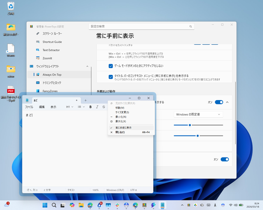 - 指定したウィンドウを常に最前面に表示する「Always on top」を改善。ウィンドウのタイトルバーの右クリックメニューから最前面表示のON/OFFをコントロールできるようになったほか、最前面ウィンドウに表示される枠の透明度のコントロールに対応
