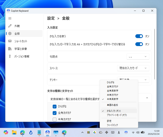 日本マイクロソフト(株)は3月24日、日本語入力システム(IME)「Copilot Keyboard」がかな入力に対応したと発表した。編集部でも、v1.0.0.4661でかな入力のオプションが導入されていることを確認している。