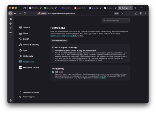 Mozillaは3月23日(米国時間、以下同)、「Firefox」の新機能「タブノート」を発表した。3月24日以降、「Firefox」で実験的な機能を試せる仕組み「Firefox Labs」(about:preferences#experimental)で提供される。