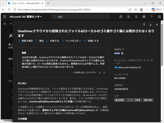 2026年5月以降、「OneDrive」および「SharePoint」の“ごみ箱”の仕様が変更されるとのこと。「Microsoft 365」管理センターで4月3日(米国時間)、アナウンスがあった。