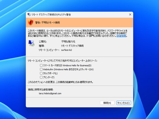 次に、接続のセキュリティ警告がダイアログで表示される。これはRDPファイルを開く(リモート デスクトップ接続を試みる)たびに、毎回表示される。