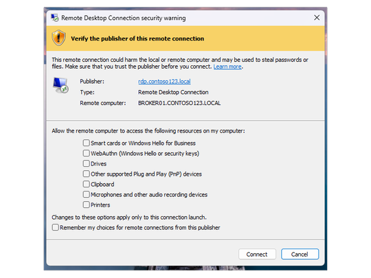- RDPファイルがデジタル署名されていない場合、警告ヘッダーがオレンジ色に