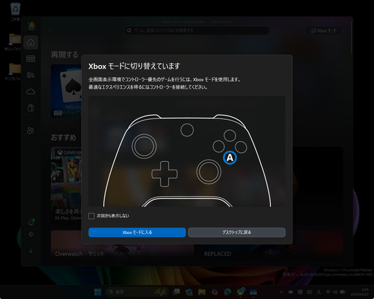 米国時間4月17日にRelease Previewチャネルでリリースされた「Windows 11」Build 26100.8313および26200.8313では、「Xbox モード」の段階的な展開が開始されている。大きな問題がなければ、間もなく製品ビルドにも導入される見込みだ。