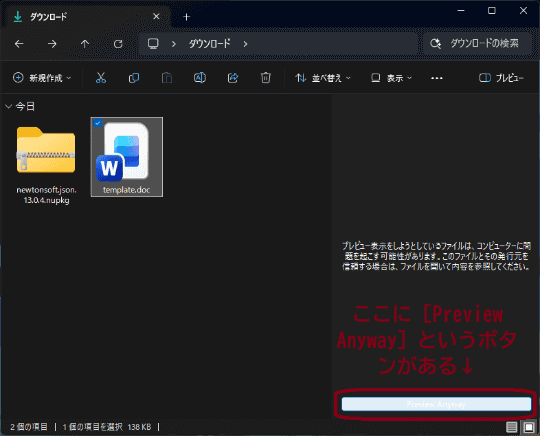 そこで本ビルドでは、プレビューペインに“とにかくプレビュー”するボタン(Preview Anyway)が追加された。上記のブロック解除の手順を省いて、無理やり「エクスプローラー」でファイルの内容をプレビューできる。