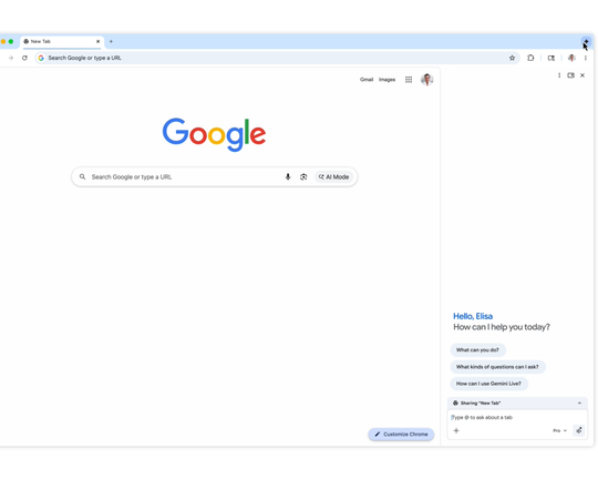 タイトルバー右端に「Gemini」アイコンが追加され、クリックでAIアシスタントのサイドパネルを開閉できるようになる。タブを閲覧しながら「Gemini」と対話できるようになるため、作業を中断する必要がなくなる。