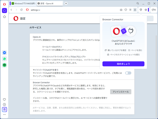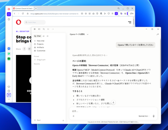これらを組み合わせれば、「ChatGPT」や「Claude」から「Opera」を操作し、閲覧ページの要約や複数タブにわたる情報の集約、オンラインリサーチなどを行える。