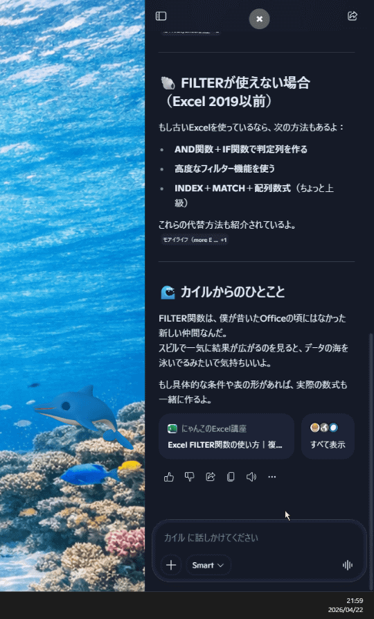 もちろん、ほかのCopilot キャラクターと同様にクリックするとデスクトップにサイドバーが表示され、会話することができる。前述したように中身はCopilotなので、Officeのマスコット時代からは想像もつかないほど賢い答えを返してくれる。音声での対話も可能だ。
