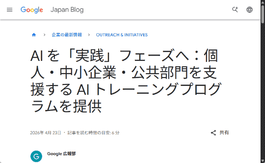 Googleは4月23日、日本国内においてAIをより具体的に業務や社会課題の解決に役立てる“実践”段階への移行を支援するため、複数の新しいAIトレーニングプログラムを提供すると発表した。