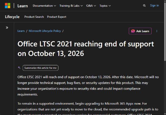 「Microsoft Office LTSC 2021」のEoSは2026年10月13日 ~Microsoftが注意喚起