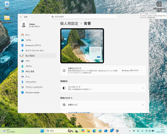 デスクトップ壁紙として「Windows スポットライト」を指定すると、コレクションに含まれる写真が日替わりでセットされ、デスクトップ隅に写真の詳細を調べるためのアイコンが表示される(Desktop Spotlight)。