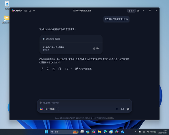 「マウスカーソルを変更したい」などと頼んでも、「Microsoft Copilot」アプリは通常、Windows 11の設定手順を示してくれるだけだ。実際に「設定」アプリを開き、オプションのあるページへアクセスするといった作業は、ユーザーが自分で行わなくてはならない。