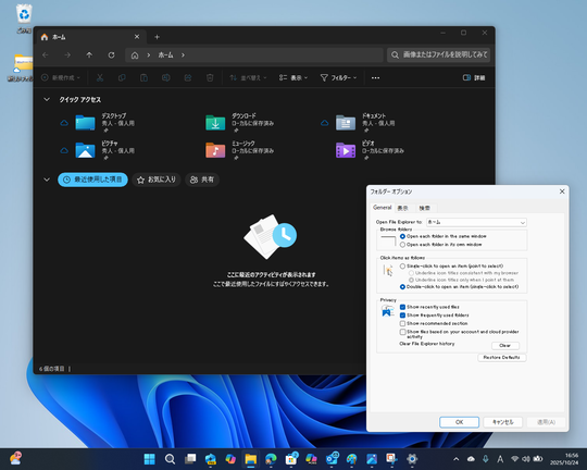 なお、[推奨]セクションを利用するには、[フォルダー オプション]ダイアログでオプションをONにする必要がある(「KB5067036」を適用するだけで設定が変わってしまうことはないようだ)。オプションを既定に戻すボタンを押すと[推奨]セクションが有効化されるため、今後は[クイック アクセス]セクションに代わり[推奨]セクションが既定のエクスペリエンスになっていくのかもしれない。