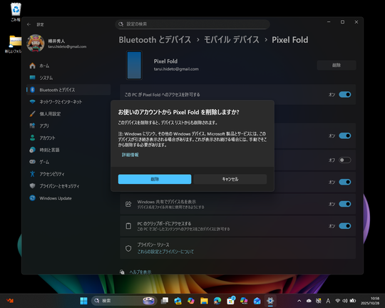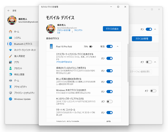 さて、このオプションは[Bluetooth とデバイス]-[モバイル デバイス]設定ページへアクセスし、[モバイル デバイス]セクションにある[デバイスの管理]ボタンを押すと現れる[モバイル デバイスを管理]ダイアログで管理できる。
