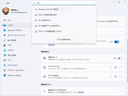 まず、「設定」アプリで検索した際に、プルダウンメニューに表示される結果が増やされた。これまでは最初の5つだけを表示する仕組みで、残りは[すべての結果を表示]をクリックして専用のページへ移動しないとチェックできなかったが、新しい「設定」アプリはプルダウンメニューにすべての検索結果を表示できるようだ。