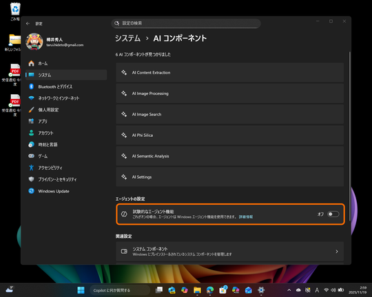 米国時間11月17日にDev/Betaチャネルでリリースされた「Windows 11 Insider Preview」Build 26220.7262(KB5070303)では、[システム]-[AI コンポーネント]設定ページに [試験的なエージェント機能] というオプションが追加されている。既定は無効だが、有効にすることで「Copilot Actions」などのAIエージェント機能が利用できるようになる。