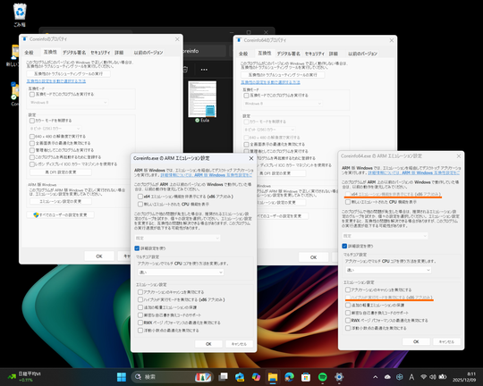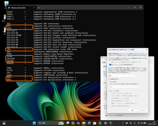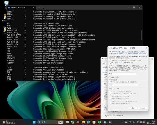 「KB5070311」では、新たにAVX/AVX2を含む拡張命令セット(BMI、FMA、F16Cなど)がサポートされている。新しい命令セットのサポートは、エミュレーション設定ダイアログの[新しいエミュレートされた CPU 機能の表示]というチェックボックスをONにすると有効になる。編集部環境ではOFFになっていたが、今後はx64(64bit)アプリで既定有効になるようだ。x86(32bit)アプリでは今後も手動で有効にする必要がある。