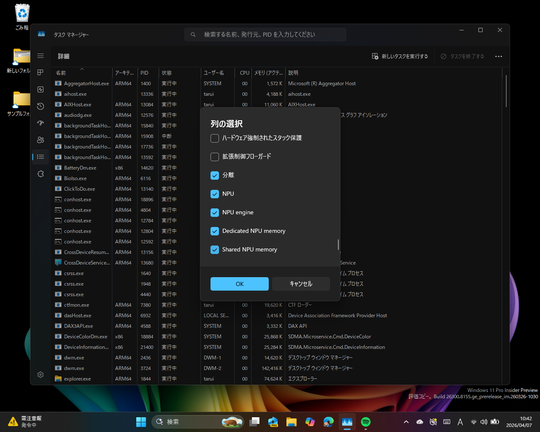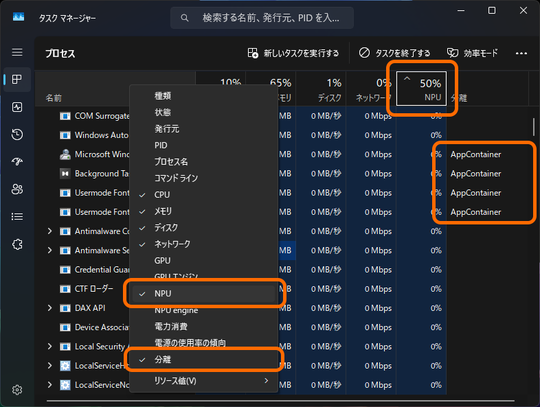 たとえば[プロセス]、[ユーザー]、[詳細]の各ページには「NPU」、「NPU engine」という新しいカラムが追加。リストビューで有効にすれば、それぞれのプロセスがどれだけNPUリソースを消費しているのかがわかる。