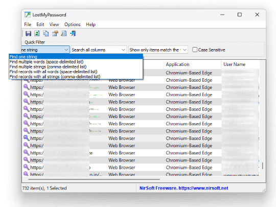 起動して、パスワードデータの検索が完了すると、メイン画面にデータアイテムの名前、前述したパスワードタイプ、アプリケーションの名前、ユーザー名、パスワード、変更日時、作成日時がリストビューで表示される。このリストビューはデータを見やすいように偶数・奇数列で色分けしたり、クイックフィルター(Quick Filter)で絞り込み表示が可能となっているので、お目当てのパスワードデータを見つけるために役立てたい。