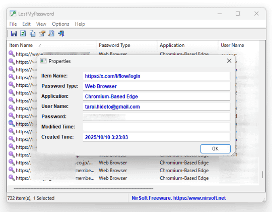 選択したデータをクリップボードへコピーしたり、HTML形式でエクスポートする機能も備える。また、パスワードだけクリップボードへコピーしたい場合は、行をダブルクリックすれば、当該行のデータを一覧できるプロパティ画面を表示できる。このプロパティ画面からなら、パスワードのコピーが簡単だ。