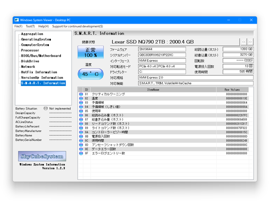 ただ、ディスクドライブの自己診断機能「S.M.A.R.T.」(Self-Monitoring Analysis and Reporting Technology)からの情報取得だけは[File]メニューから行う仕組みで、管理者権限が必要となる。ユーザーインターフェイスは「CrystalDiskInfo」に酷似しており、それをそのまま埋め込んだもののようだ。