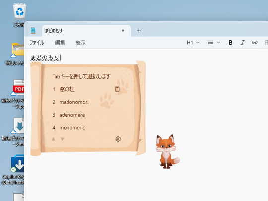 - ミカ:キツネ。IMEは巻物を開いたかのようなウィンドウに