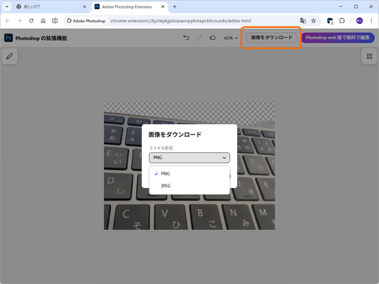 できあがった画像は、編集画面の上にある[画像をダウンロード]ボタンでPCにダウンロード可能。ファイル形式はJPEGとPNGが選べる。