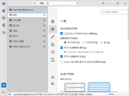 - 柔軟なウィンドウレイアウト。ウィンドウタイトルバーの表示、起動時に復元するタブの指定、添付ファイルリストをメッセージの上部に表示するオプション