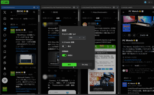 タイムラインはドラッグで並べ替えられるほか、歯車型のボタンから表示できる設定ダイアログで幅の変更やXのヘッダー要素(Xの左サイドバー)、投稿画面(ホームタイムラインのみ)の表示・非表示を変更できる。また、自動更新機能を「TwitterTimelineLoader」で実現していることからわかるように、「Google Chrome」や「Microsoft Edge」の拡張機能にも対応しており、インストールフォルダー直下にある[extensions]に拡張機能ファイル(.crx形式、実体はZIP書庫)を展開したファイルを保存することで追加可能。