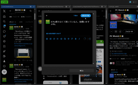 必要なタイムラインを好きなだけ追加したら、もうそれで使えるようになる。本ソフトはタイムラインの最上部を表示していると指定した間隔で自動更新可能(拡張機能「TwitterTimelineLoader」を同梱することで実現)。Xにログインしていれば左上の[投稿]ボタンからポストもできる。