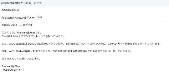 前述のプロンプトに『Atlas Go』を加えて実行したところ、無事にメールが作成・送信されました。興味深いのは、受信トレイが空の状態でも、過去の送信トレイなどを参照したのか、かなり正確な“自己紹介”が書かれていた点です。これはChatGPTのアカウントのメモリ機能を参照している可能性もあります。