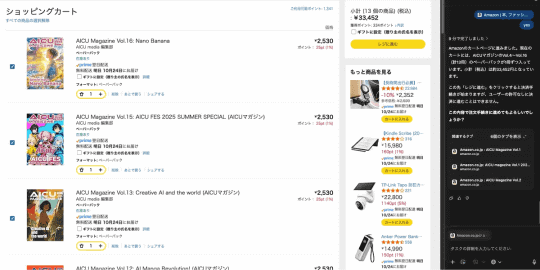 これは圧巻です。『今ログインしているAmazonのアカウントで、AICUマガジンのVol.1-16ペーパーバックを1冊ずつカートに入れて購入してください』と指示してみました。実は、AICUマガジンはVol.4からしかペーパーバック版が存在しない、しかも『アイキュー』や『マガジン』といった“ゆらぎ”を含むという“意地悪なタスク”でしたが、Atlasは見事にクリア。約9分で、Vol.4からVol.16までの計13冊を正しくカート投入することに成功しました。