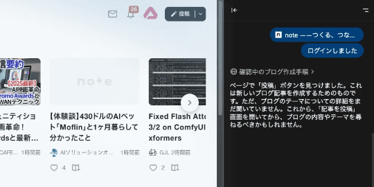 単純な投稿はもちろん、元記事(noteブログ)のURLを渡し、『魅力的な連続スレッドツイートを作成して投稿して』という複雑な指示も実行できました。画像や内容の最終確認は必要ですが、手間のかかる要約ツイート作業を大幅に効率化できる可能性が示されました。