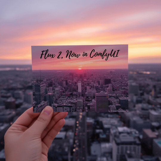 - 文字情報:筆記体で「Flux 2, Now in ComfyUI」と書かれている。