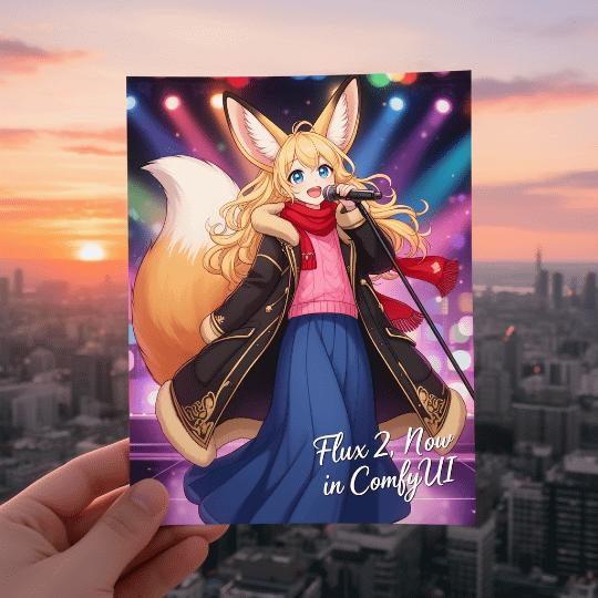 cute anime girl with gigantic fennec ears and a big fluffy fox tail with long wavy blonde hair and large blue eyes blonde colored eyelashes wearing a pink sweater a large oversized gold trimmed black winter coat and a long blue maxi skirt and a red scarf, she is happy while singing on stage like an idol while holding a microphone, there are colorful lights, it is a postcard held by a hand in front of a beautiful city at sunset and there is cursive writing that says "Flux 2, Now in ComfyUI"