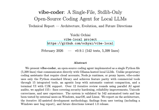 要旨: 本稿では、Ollama上で動作するローカルLLMと直接通信する単一Pythonファイル(5,399行)として実装されたオープンソースのコーディングエージェント vibe-coder を提示する。 クラウドアカウント、Node.jsランタイム、プロキシ層を必要とする既存の商用コーディング支援ツールとは異なり、vibe-coderはPython標準ライブラリのみで構成され、15の統合ツール、エージェントループ(自動コンテキスト圧縮付き)、CJK対応ターミナルUIにより商用ツールと同等の機能を実現する。 並列AIエージェント監査による12回の反復レビューを通じて、セキュリティ強化、信頼性向上、Unicode正確性、ユーザー体験改善に関する155件以上の修正を適用した。本システムは542の自動テストで検証され、Windows、macOS、Linuxの外部ユーザーによる実地テストも行われている。本稿では、アーキテクチャ、AI支援による反復開発手法、ユーザーテスト結果(Windowsユーザーのバグ報告を含む)、および1.0リリースに向けた今後の方向性を報告する。