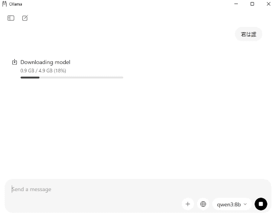 画面右下のタスクトレイに表示される「Ollama」のアイコンをクリックすると、GUIからモデルをダウンロードできます。今回使うのは「qwen3:8b」(約5.2GB、メインモデル)と「qwen3:1.7b」(約1.3GB、軽量ヘルパー用のサイドカー)の2つです。サイドカーモデルは権限チェックや初期化といった軽いタスクを担当するもので、自動的に選択されます。