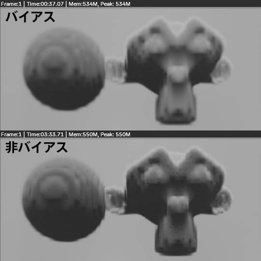 一方、デメリットには、レンダリング時間が長くなること、ノイズが増加することがあります。そのため、従来のバイアスによる方法もオプションも残されています。
