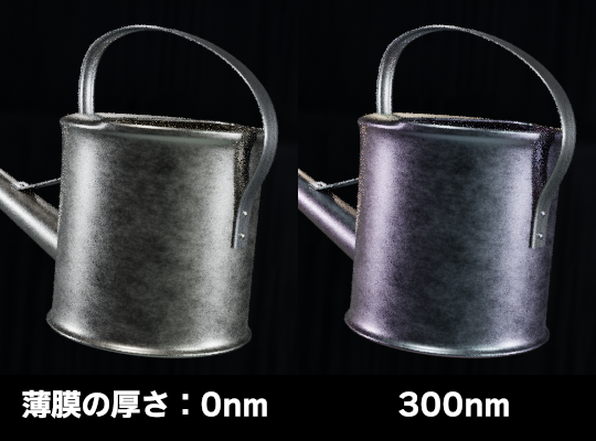 チタンや銅などの金属表面にできる酸化膜により、虹色に反射する現象を表現できます。物理ベースの値の指定には、PHYSICALLY BASEDを参考に、[薄膜の厚さ]は200nmから300nmぐらいをお勧めします。