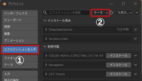 テーマが更新可能かどうかは、プリファレンス([編集]-[プリファレンス...]メニュー)にある[エクステンションを入手]の[テーマ]カテゴリから確認できます。