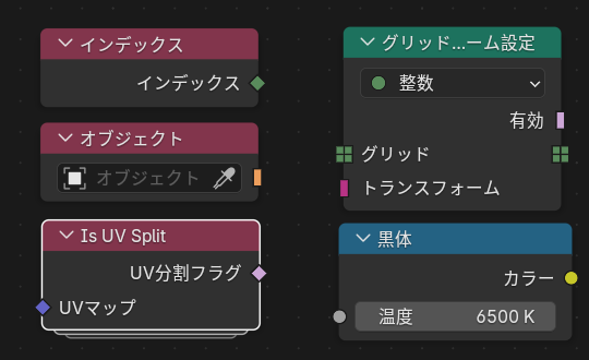 ノードソケットの形状が一新され、『●』は様々な種類の値、『■』が単一値、『◆』がフィールド(インデックスなどの変化する値)、『田』がグリッドまたはリストになります。色はデータタイプを表します。