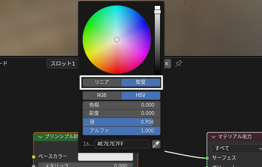 カラーピッカーには新しく[リニア]と[知覚]モードが追加されました。これは内部表現のリニアカラーと、知覚的なカラーのいずれかで色を設定できます。