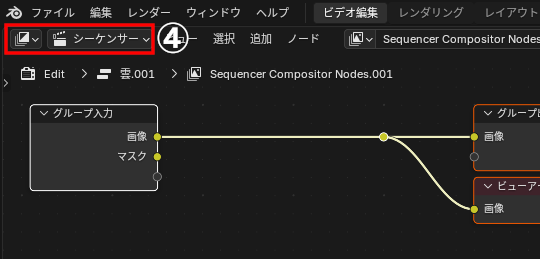 追加したノードツリーを編集するには、ビデオ編集ワークスペース内のどこかのエディターをコンポジターに変更し、左上のセレクターを[シーケンサー]モードに切り替えます。他のワークスペースで同様に設定してもうまくいかないようです。