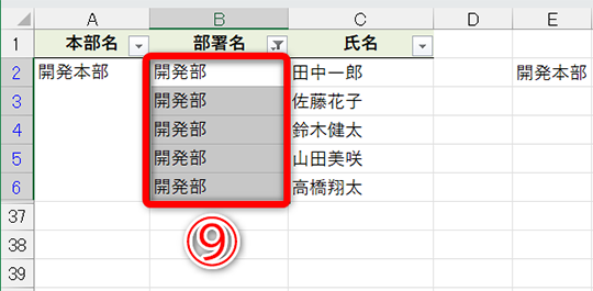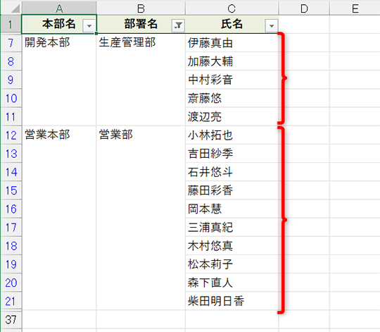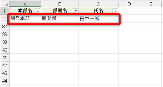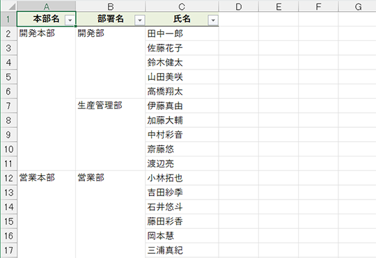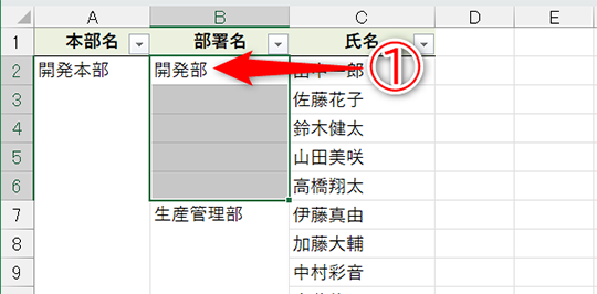 エクセルに慣れていれば、表内に結合セルが含まれていると思い通りにフィルターが動作しないということはご存じですよね? 例えば、以下のような表で「開発部」のみに絞り込もうとするとうまくいきません。
