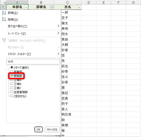 本当にフィルターが動作するのか確認してみましょう。先ほどと同じように「開発部」に絞り込んでみます。