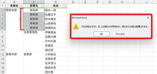 セルB3~B6にも「開発部」と入力して、結合すればいいのでは? と思うかもしれませんが、メッセージが表示され、[OK]をクリックすると、セルB3以降のデータは破棄されてしまいます。このメッセージは何度も見たことがあるでしょう。